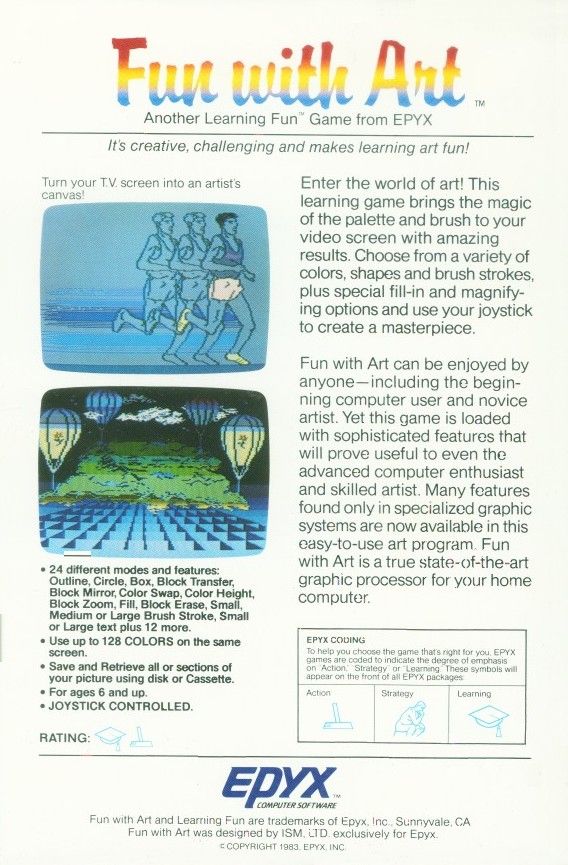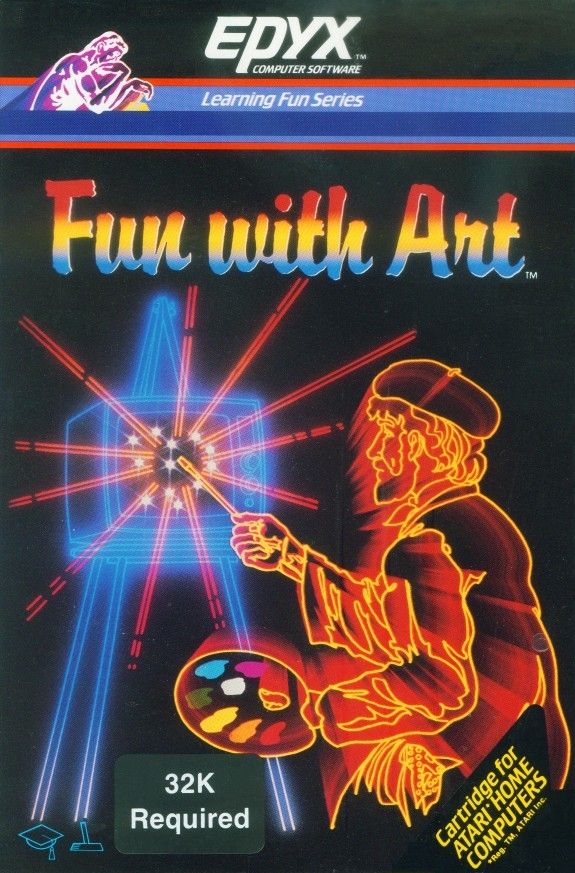 Released in 1983, Fun with Art was part of the Learning Fun Series, and offered Atari home computer users the ability to create art with 24 Different modes and features including Outline, Circle, Box, Block, Transfer, Block Mirror, Color Swap, Color Height, Block Zoom, Fill, Block Erase, Small, Medium or Large Brush Stroke, Small or Large text plus 12 more. Along with the ability to use 128 colors on the same screen.